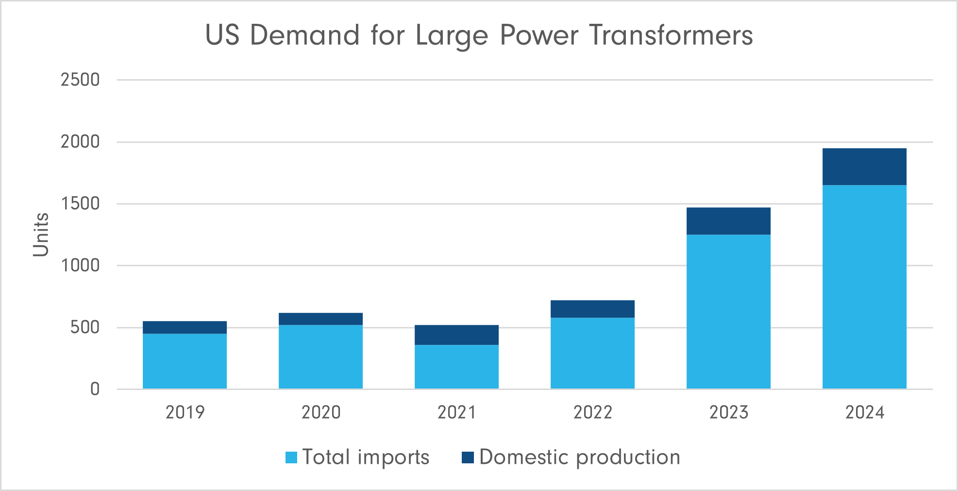 Folglich sind die USA stark von Importen abhängig, auf die 2024 fast 90 Prozent ihres Bedarfs an großen Leistungstransformatoren entfielen (Abbildung 3), was den Netzausbau effektiv mit der globalen Produktionskapazität und der Stabilität der Lieferkette verknüpft.