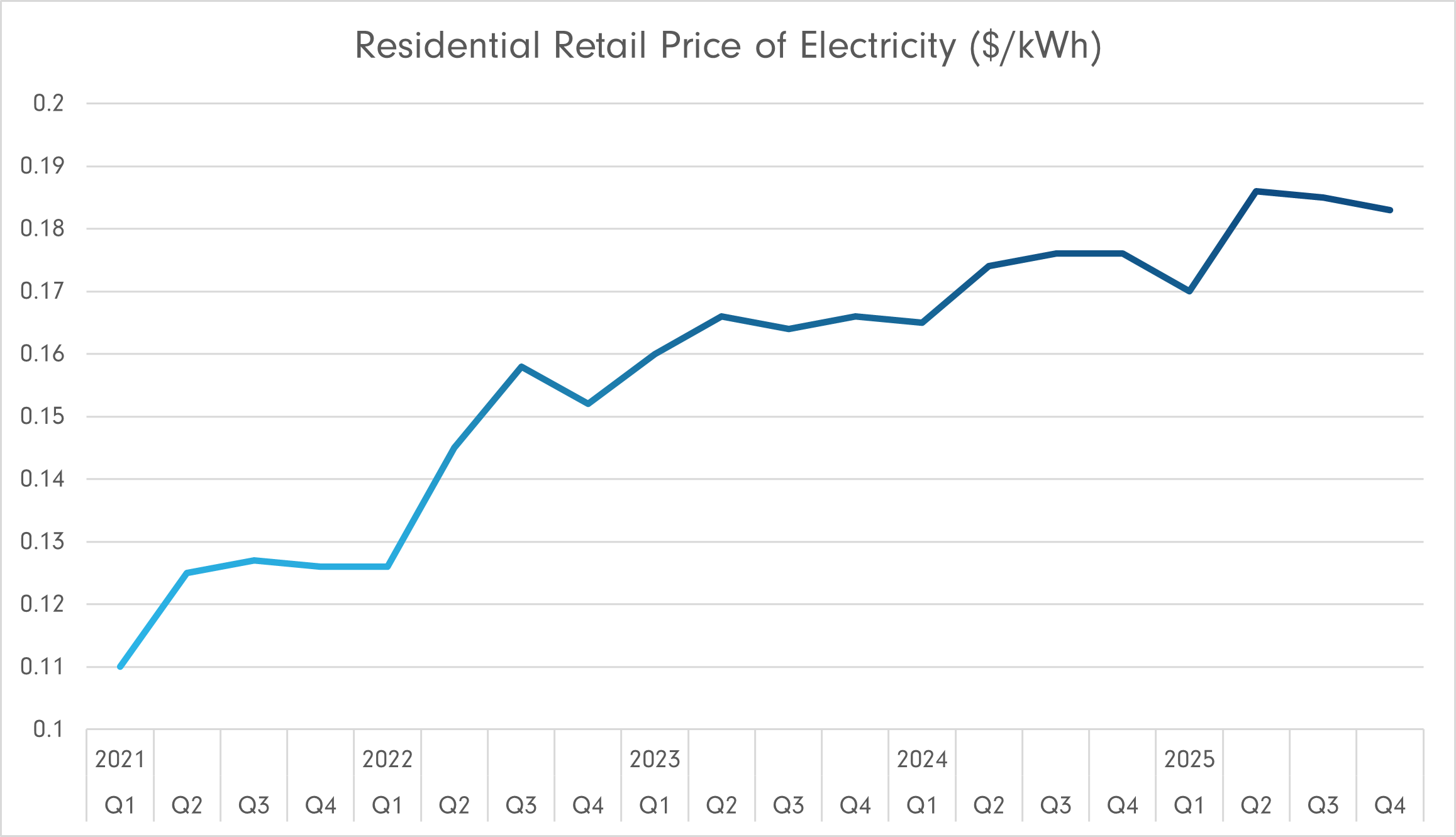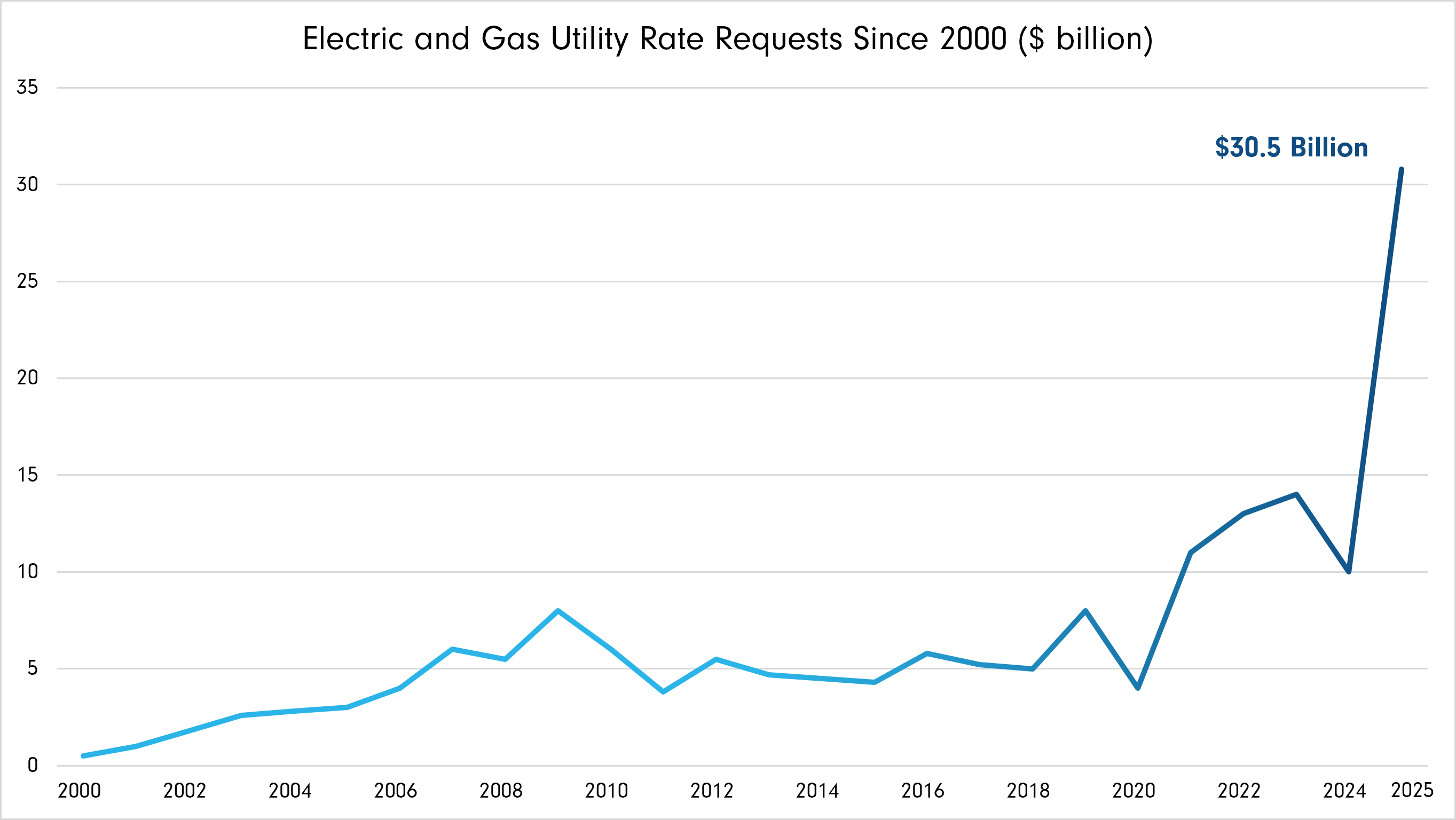Dieser Druck wirkt sich nun auf die Verbraucher aus. Die Versorgungsunternehmen machen sich zunehmend höhere Beschaffungskosten durch Tarifanpassungen zunutze. Im Jahr 2025 beantragten US-Versorger Tariferhöhungen in Rekordhöhe von 31 Milliarden US-Dollar (Abbildung 6), mehr als das Doppelte des Vorjahres, während die Strompreise seit 2021 um etwa 40 Prozent gestiegen sind (Abbildung 7).