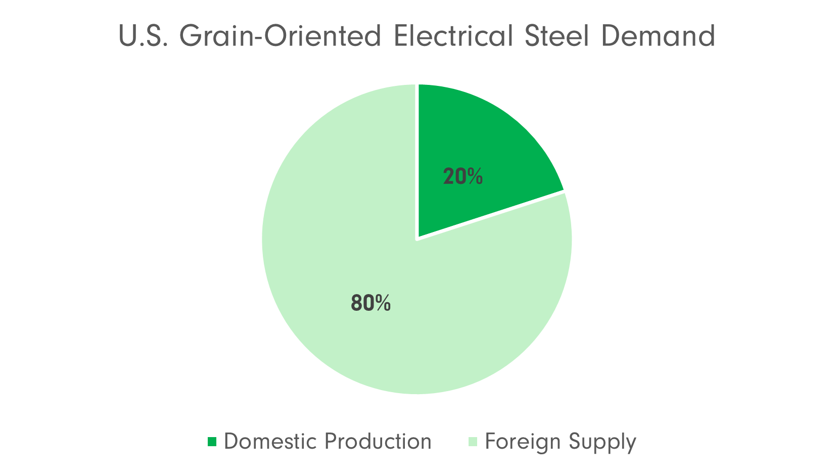 Das kritischste Input bei der Herstellung von Transformatoren ist kornorientiertes Elektroband (GOES), das oft als der magnetische Kern des Geräts bezeichnet wird. Die inländische Produktion von GOES ist stark konzentriert, und Cleveland-Cliffs betreibt die einzigen Anlagen in den USA, die das Material herstellen können.